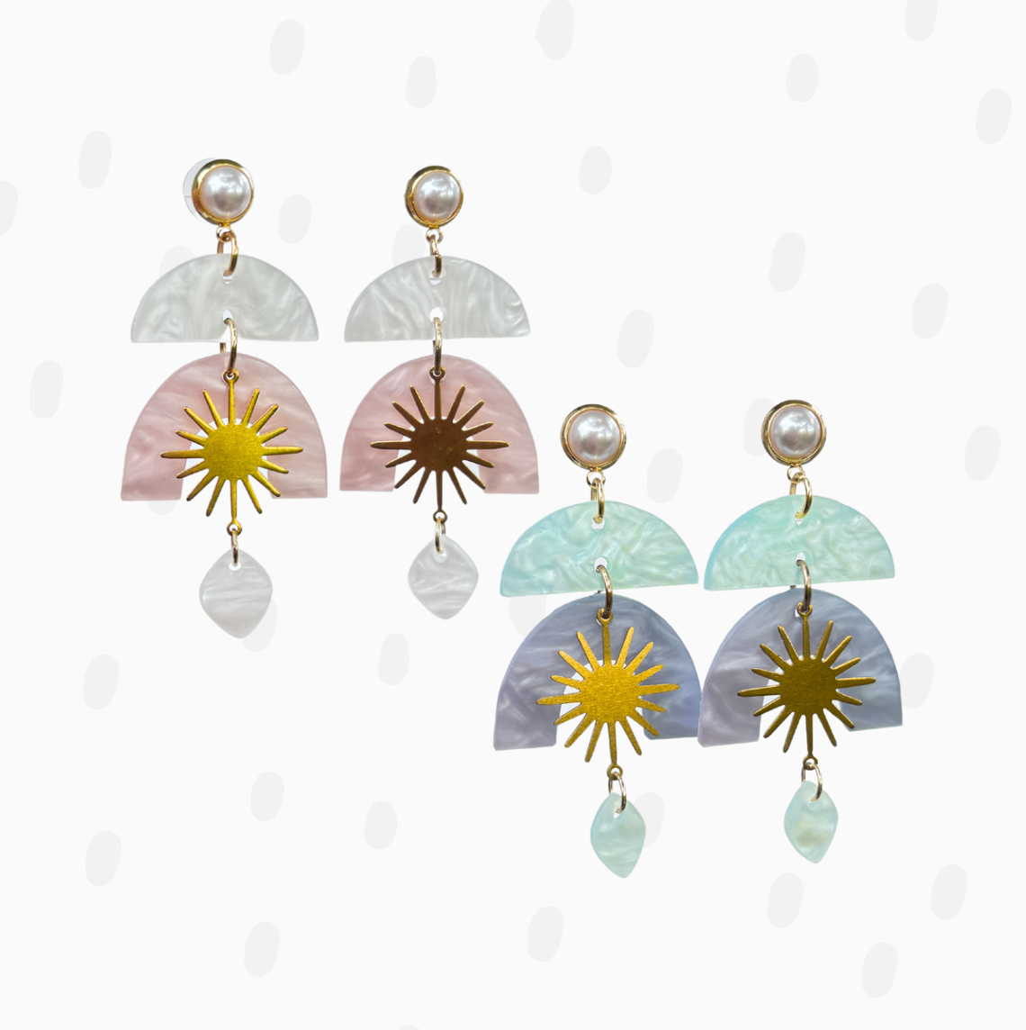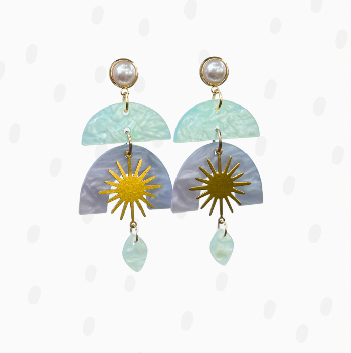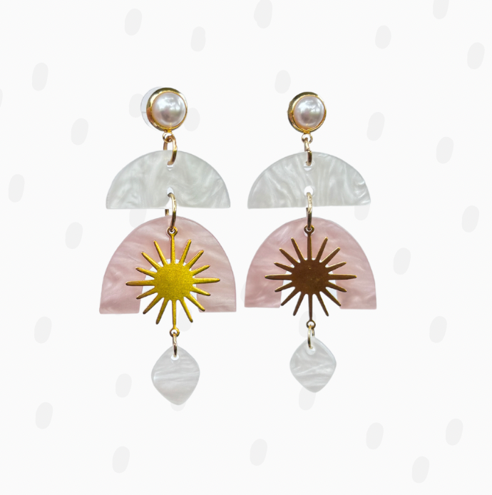 The Solar Flare features laser-cut acrylic with a pearlized shimmer and bold brass accents. Lightweight but full of glow, they’re made to move with you and sparkle in the sun.