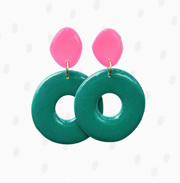 Celestial Pop is a large dangle earring made from green and pink polymer clay, sealed in glossy resin for a smooth, glass-like finish. Lightweight but eye-catching, these earrings bring major personality to any outfit.
