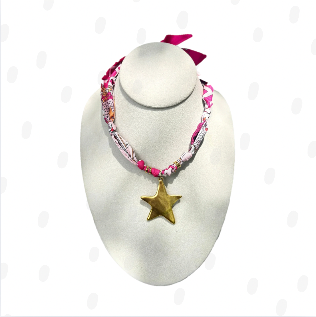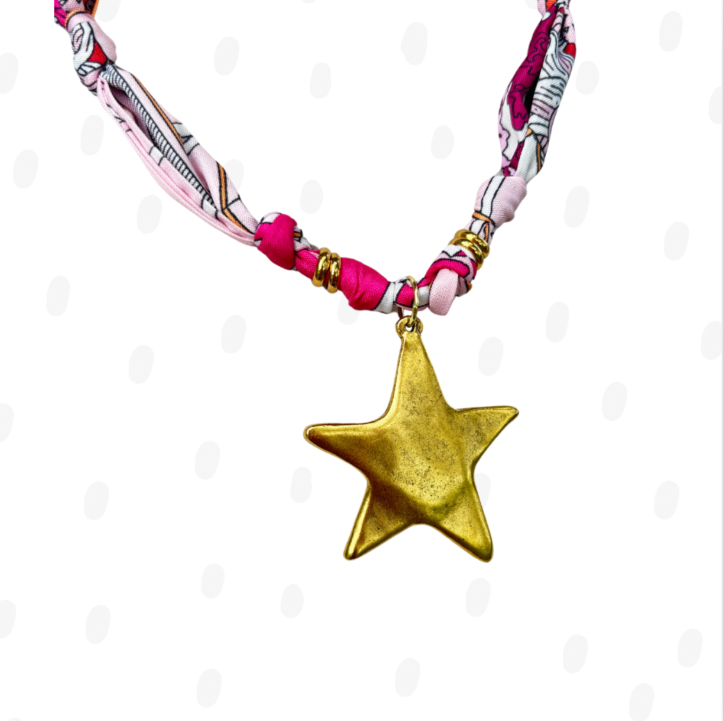 This is a soft, hand-tied scarf necklace featuring a bold, 12k gold-plated star pendant. Each pendant is handmade by a U.S. jeweler. The light, neutral gold flatters every skin tone, and the vibrant scarf adds a fun pop of color.