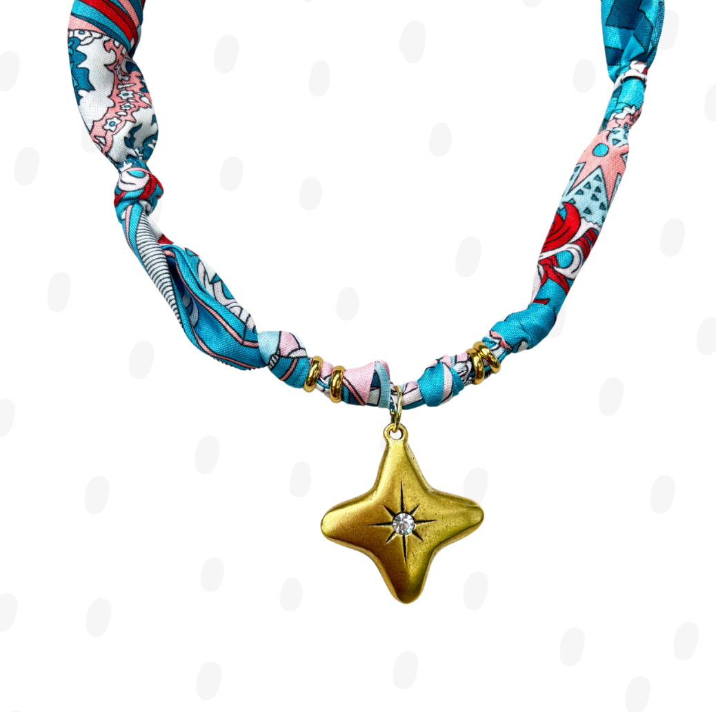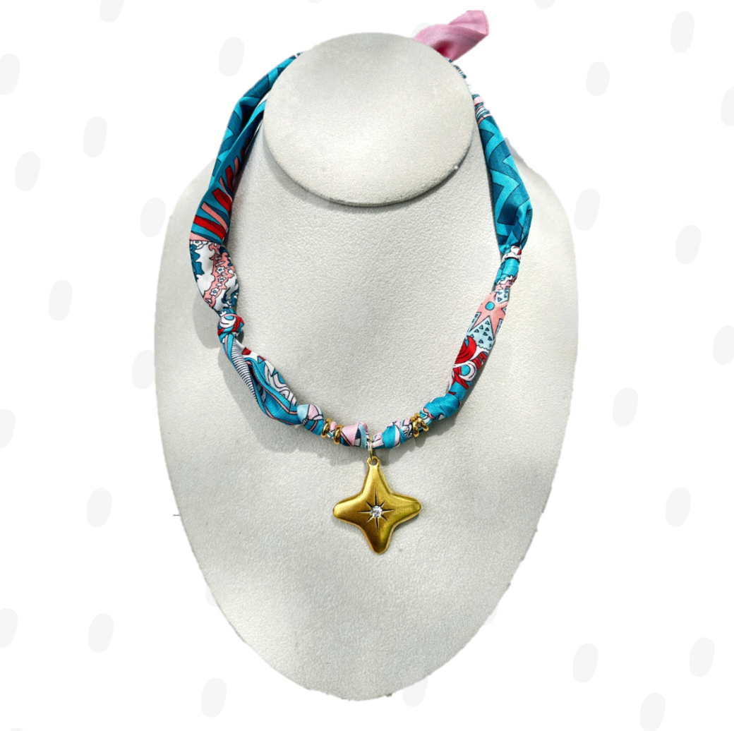 This is a soft, hand-tied scarf necklace featuring a dreamy, 12k gold-plated starburst pendant with a sparkling center stone. Each pendant is handmade by a U.S. jeweler. The light gold tone pairs beautifully with the vibrant blue and coral scarf for a playful, celestial-inspired look.