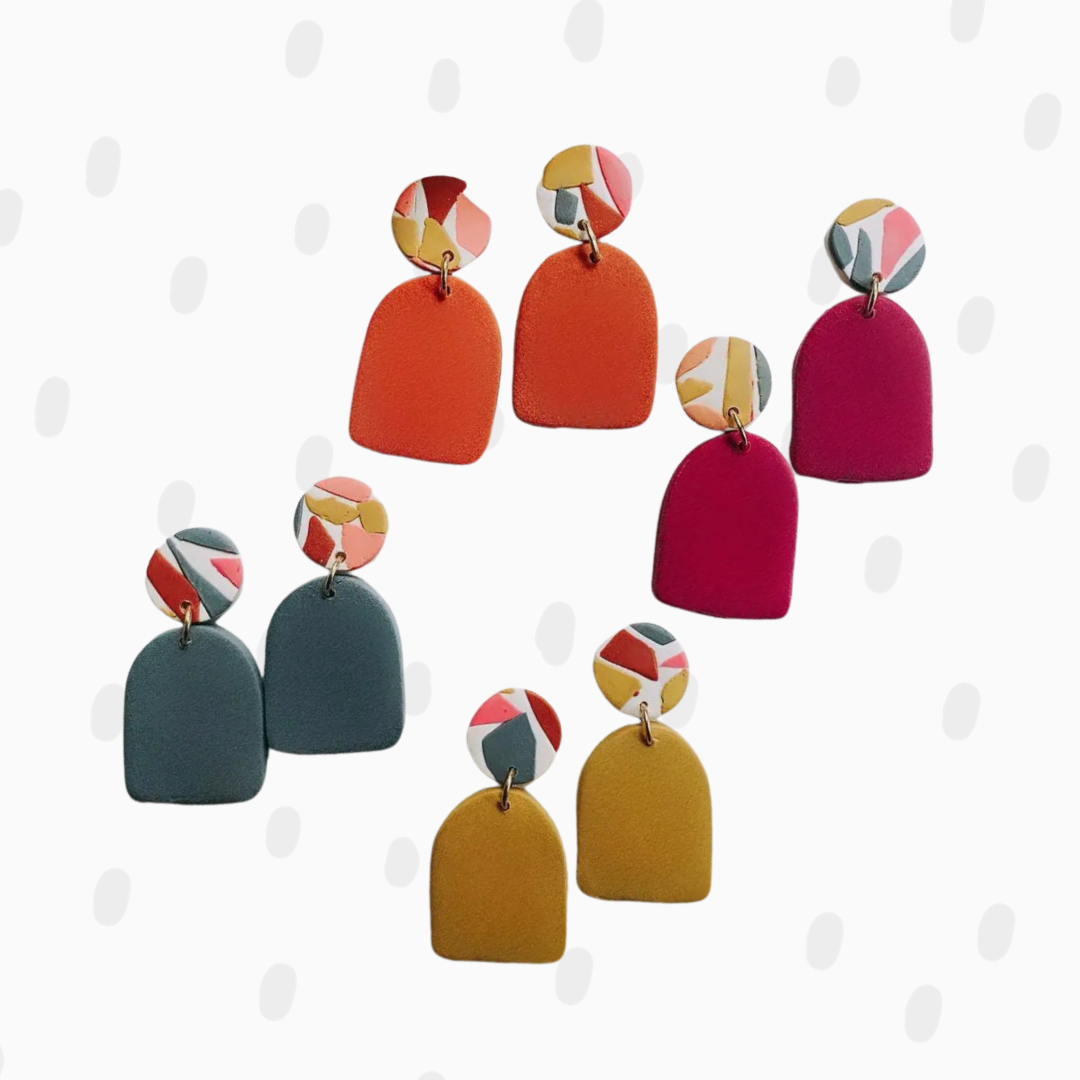 These dangle studs are made of Polymer Clay and set on to gold plated, hypo-allergenic surgical steel hooks. Lead and nickel free. Ultra lightweight.